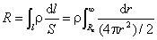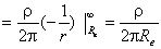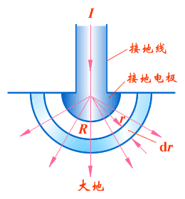 例题 04-12-03 如图,一半径为Re的半球体电极与大地接触,当接地线中的电流I在接地电极处均匀地向无限远处流散时,求接地电阻R。设大地的电阻率为ρ。 解 由于电流从半球体电极的中心向大地四周均匀地流散,故可作一半径为r、厚度为dr的半球壳,由上式得电阻为