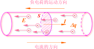 最后我们指出,虽然金属导体中的电流,乃是带负电的自由电子逆着电场方向作有规则的定向移动(右图)。但是在历史上规定正电荷移动的方向作为电流 的方向(以后统称"流向")。这就是说,在金属导体中,我们把实际上负电荷的移动都想象地看作是正电荷沿着相反方向、即循着电场方向的移动。实验证明,这在效果上是等同的。