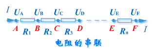 把阻值分别为 、 、 、...、 的n个电阻一个接一个地串接起来,就成为下图所示的串联电路 。设起点 和终点 的电势分别为 和 ,且 > 。由于串联电路中没有支路,故而经过任一电阻的电流强度I均应相等。若每个电阻两端的电势分别为