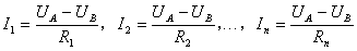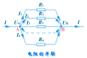 的 个电阻的一端连结在一个公共点A上,把另一端连结在另一个公共点B上(下图)。设 、 两点的电势分别为 和 , 则由于每个电阻都跨接在相同的两点 、 之间,所以每个电阻两端的电压都 - ,通过每个电阻的电流分别为