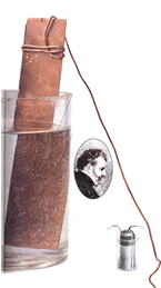 公元1836年,英国教授丹尼尔制造出一种可长时间供应电流的简单电池。上图的丹尼尔电池是以浸泡在硫酸铜溶液中的铜质圆筒为正极,以浸泡在硫酸中的锌棒为负极。两者之间隔着具有许多透水孔的容器。丹尼尔电池可产生约1伏的电,主要作为实验电源。