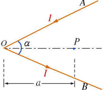 作业 04-13-05-02 折成角的长直导线AOB 通有电流 (见图),求在角平分线上,离角的顶点处P 点的磁感强度。(提示:AO、OB 段都是一端有限、而另一端无限长的电流。)