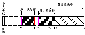 每级光谱中靠近中央条纹的一侧为紫色,远离中央条纹的一侧为红色。由于各谱线间的距离随着光谱的级次增加而增加,所以级次高的光谱彼此重叠。