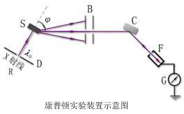 R为伦琴射线管,发出波长为的单色X射线。通过光阑D形成一束射线投射到散射物S(石墨)上。散射线通过光阑B形成定向的射线束, 可由散射角φ 表征。入射到晶体C和电离室F的摄谱仪上可记录散射线的波长及其强度。伦琴射线管 R和石墨 S可以一起转动,以改变散射角φ。实验数据指出:
