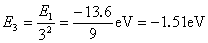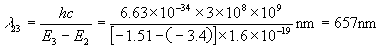 解:氢原子所能吸收的最大能量就等于对它轰击的电子所携带的能量12.2eV。氢原子吸收这一能量后,将由基态能级 激发到更高的能级 ,而 由 得 由此可求得与激发态 相对应的n值,即 因n只能取正整数,氢原子所能达到的能级对应于n=3。这样,当电子从这个激发态跃迁回基态时,将可能发出三种不同波长的谱线,它们分别相应于n=3到n=2,n=2到n=1,和n=3到n=1。