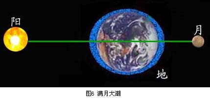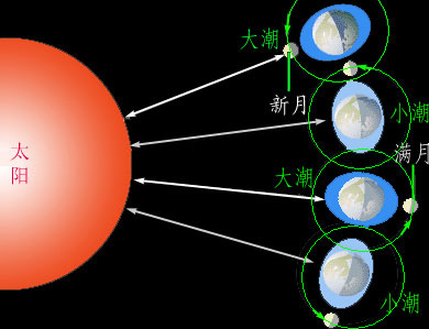 将月球质量 实际上,潮高为 在月球和太阳的共同作用下,海洋潮汐就很有规律性。每逢农历初一、十五时,即在朔日(新月)和望日(满月),太阳、月球和地球三个天体差不多在同一条直线上,月球与太阳的引潮力几乎作用于同一个方向,两者的合力最大,此时海水受到的引潮力最大,太阳潮和太阴潮相加形成大潮,潮高可达0.81m,如图6所示。到了初八(上弦),二十三(下弦),月球和太阳对地球的方位相互垂直,此时太阳引潮力和月球引潮力两者合力最小,这时潮涨得不高,落得也不低,形成小潮,潮高为0.31m,如图7所示。一个月内月球、太阳通过地球的相对位置在一条直线或相互垂直的情况出现两次(如图8),因此,小潮和大潮也各出现两次。