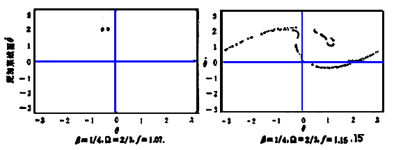 f增至1.35和1.45时,运动又恢复较简单形式:1倍和2倍周期解,只不过由前面的往复摆动变为单向旋转。f 为1.47时出现4倍周期的旋转运动。f为1.50时又出现似乎无规的复杂运动。 为了观察上述复杂变化,庞加莱发明了另一种更简化的描绘方法——庞加莱截面法,按(1)式增加一个变量