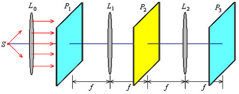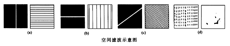 在此装置中,如果在变换面 在变换面上放置一个遮光屏,它只允许某些空间频率的光信号通过,这样所得到的象就只含有和透过的空间频率相对应的光信息,这就改变了像的质量,从而可以取得原图像信息中那些人们特别感兴趣的光学信息。放在变换面上的遮光屏实际上起了选频的作用,因而遮光屏又称为空间滤波器。低通滤波器是指只允许低频信号通过的滤波器。这时,遮光屏只在中央有个圆孔。如果遮光屏只是一个较小的不透光圆屏,则较高空间频率的光信号可以从其周围通过,因而称为高通滤波器。 空间滤波是光学信息处理的一种方式。如下图(a),滤波器是只在中央留有一条竖直缝的遮光屏,则只有中间一条竖直列的光斑发的光可以通过,因而只保留了竖直方向空间频率,于是在像平面上只出现原来水平光栅的像。同样道理,滤波器是只在中央留有一条水平缝的遮光屏,则其象平面上将形成原来竖直光栅的像(图(b))。有斜缝的滤波器,则形成斜缝光栅的像(如图(c));若将正交光栅的频谱制成“负片”,频谱图上的亮点就被抹黑,而其它处透明。这样的滤波器可以档住网格的所有信息,但部分网格上的污点能在像平面上出现,如图(d)所示。