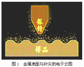 扫描隧道显微镜是根据量子力学中的隧道效应原理,通过探测固体表面原子中电子的隧道电流来分辨固体表 根据量子力学原理,由于电子的隧道效应,金属中的电子并不完全局限于金属表面之内,电子云密度并不是在表面边界处突变为零。在金属表面以外,电子云密度呈指数衰减,衰减长度约为1nm。用一个极细的、只有原子线度的金属针尖作为探针,将它与被研究物质(称为样品)的表面作为两个电极,当样品表面与针尖非常靠近(距离<1nm)时,两者的电子云略有重叠,如图1所示。若在两极间加上电压U,在电场作用下,电子就会穿过两个电极之间的势垒,通过电子云的狭窄通道流动,从一极流向另一极,形成隧道电流