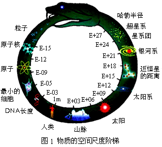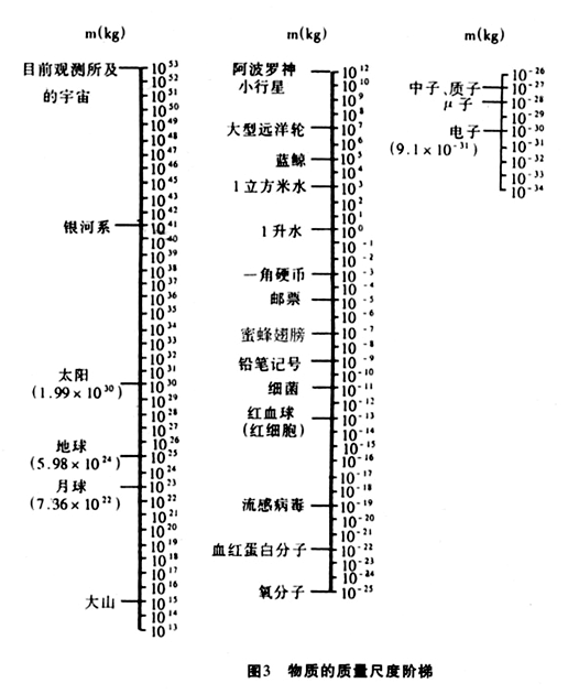 众所周知,世界是由物质组成的,物质科学的研究成就向我们展示了一个大到总星系、星系团、银河系、太阳系、地球、月球,小到分子、原子、原子核、粒子的结构层次。从空间尺度上讲,已知的物质世界在以米为单位的尺度上,至少跨越了42个数量级()。以时间表征物质运动的持续性,物质时间尺度的数量级从粒子寿命的到宇宙年龄的,跨越了43个阶梯(如图2所示)。在以千克(kg)标准单位对物质惯性和万有引力强度性质进行描述时,物质的静质量尺度的数量级梯度是如图3所示的87个数量级。